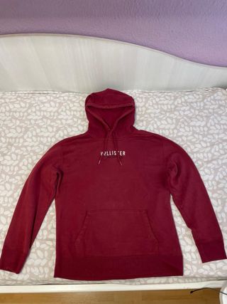 Sudadera Hollister con capucha y cremallera. Color: Rojo efecto desgastado menos intenso que en las fotografías. Talla M. Medidas: 68'5 cm de largo, 52 cm de axila a axila y 81 cm de manga desde el cuello. Usada 4 veces. En muy buen estado.