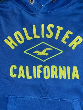 Sudadera con capucha de la marca Hollister. - Color azul vibrante. - Diseño con logo Hollister California en verde. - Bolsillo frontal tipo canguro. - Capucha ajustable con cordones.