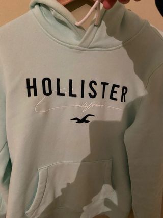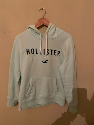 Sudadera con capucha de la marca Hollister. Talla s pero es completa, tanto de largo como de ancho.Completamente nueva, solo puesta una vez - Color verde clarito. - Bolsillo frontal tipo canguro. - Cordones en la capucha.