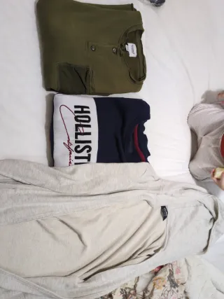 Lote de ropa en muy buen estado. Se vende junto o por separado. Sudadera Cruyff azul clara (talla M), la más valiosa (PVP ~60€), usada solo 3–4 veces. Sudadera Hollister negra (talla M), más uso y precio ajustado. Jersey Zara verde (talla M), usado pero en buen estado. Jersey Zara azul grisáceo (talla S), algo más corto y fino, ideal entretiempo, usado 3–4 veces. Más info por chat.