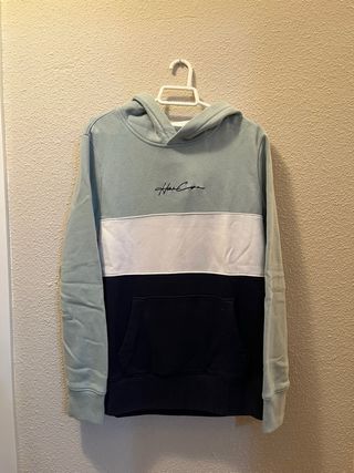 Sudadera con diseño de bloques de color. - Parte superior en verde menta. - Banda central blanca. - Parte inferior en azul marino con bolsillo. - Logo bordado en la parte superior y capucha Marca Hollister Talla XS