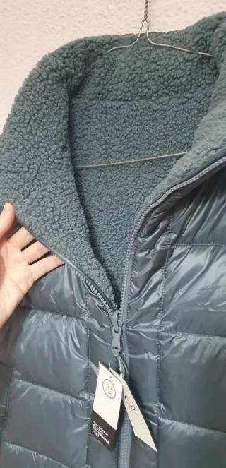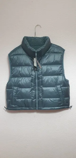 Chaleco acolchado de estilo moderno. Tiene un pequeño desperfecto pero es mínimo, se puede ver en la última foto. - Diseño sin mangas. - Cierre de cremallera frontal. - Cuello alto. - Bolsillos laterales. - Cordón ajustable en el bajo.
