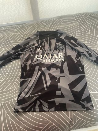 Sudadera deportiva de manga larga. - Diseño con cuello redondo y cierre de cremallera parcial. - Paneles blancos en los hombros. - Logo de Jordan y escudo del Paris Saint-Germain. - Inscripción QATAR AIRWAYS en el pecho. - Detalle de texto PARIS en la manga.