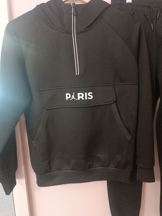 Conjunto de chándal infantil de dos piezas. - Sudadera con capucha y bolsillo frontal. - Pantalón con cintura elástica y cordón. - Diseño con logo y texto 'PARIS'. - No es marca Jordan pero está comprado en tienda de deportes