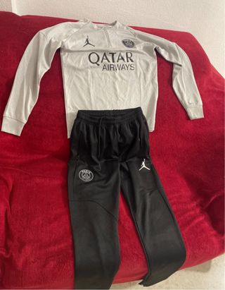 Conjunto de chándal del Paris Saint-Germain. - Sudadera gris con cremallera. - Pantalón negro con cordón ajustable.