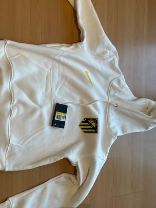 Sudadera con capucha del Atlético de Madrid. - Diseño en color blanco. - Logo de Nike en amarillo. - Escudo del club en la parte frontal.