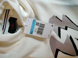 Sudadera con capucha de la marca Jordan, Legacy Air 6 Fleece, en color blanco. - Diseño con logo estampado en forma de diamante en el pecho. - Bolsillo canguro frontal. - Inscripción AIR en la manga derecha. - parte de atràs con logo nike y banda en naranja. Alguna mancha del uso pero bien conservada