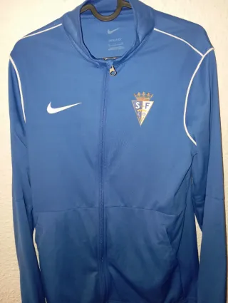 Chaqueta fina de entrenamiento del equipo español de fútbol, CD San Fernando, de Cádiz. Marca Nike, talla S. - Diseño deportivo con detalles blancos. - Logo del equipo en el pecho. - Cremallera frontal.