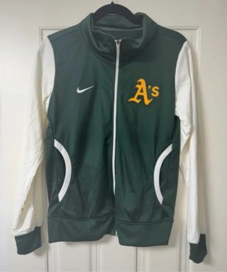 Chaqueta deportiva con el logo de los A's. - Diseño con mangas blancas y cuerpo verde. - Cierre de cremallera frontal. - Bolsillos laterales. - Cuello alto.