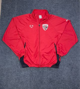 Chaqueta deportiva vintage del FC Ingolstadt 04. - Talla L pequeña - tiene un agujero en las mangas - Diseño en color rojo y negro. - Logo de Nike bordado. - Escudo del equipo en el pecho.