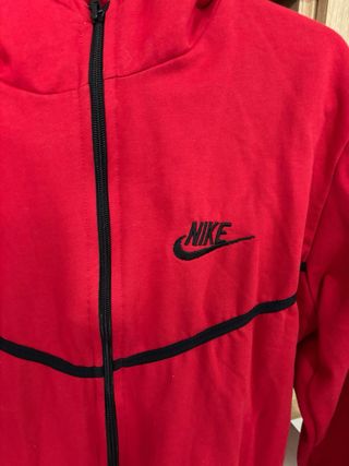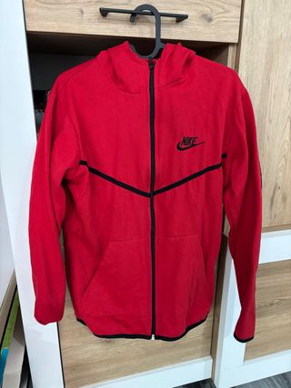 Sudadera con capucha Nike Tech Fleece en color rojo. Diseño moderno y cómodo. - Cremallera completa. - Bolsillos laterales con cremallera. - Logo de Nike bordado en el pecho. (Precio negociable) Con una pequeña rotura en la parte de la capucha