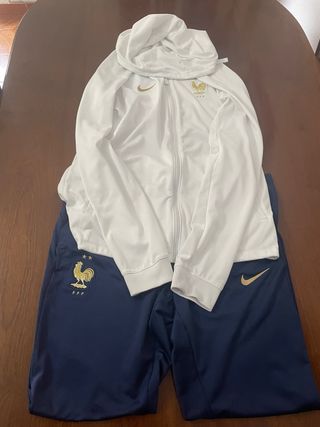 Conjunto de chándal del Paris Saint-Germain. - Sudadera de manga larga con media cremallera. TALLA L - Pantalón largo. TALLA M - Diseño con el logo del equipo y patrocinador.
