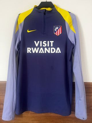 Sudadera del Atlético de Madrid de la temporada 2025/2026. - Diseño con cuello alto y media cremallera. - Mangas de color gris claro y cuerpo azul marino. - Detalles amarillos en los hombros y cuello. - Escudo del club y logo de Nike. - Inscripción VISIT RWANDA en el pecho y espalda.