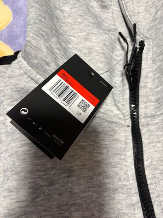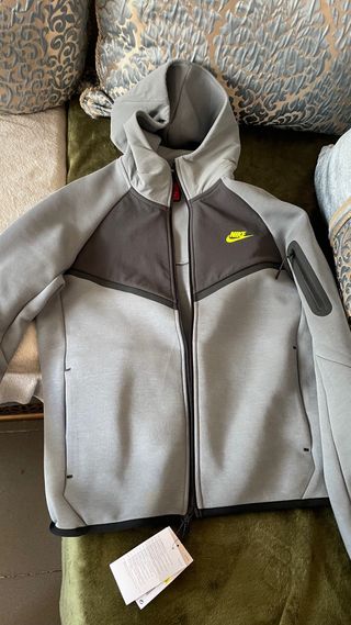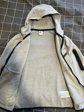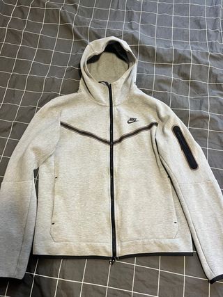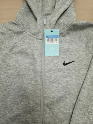 Sudadera oficial Nike Tech en color gris y talla L. Presenta un diseño moderno con detalles en negro. - Cremallera frontal completa. - Bolsillo con cremallera en la manga. - Capucha ajustable.