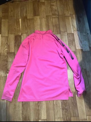 Sudadera de entrenamiento del FC Barcelona. Estado el de la foto. - Diseño en color negro con detalles en rosa y azul. - Cuello alto con media cremallera. - Logo del club y de la marca en el pecho. - Terminal de la manga para meter el dedo Pulgar. - Talla S - M Pequeña. Hago envíos