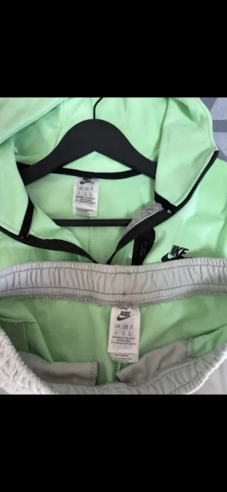 Conjunto de chándal Nike en talla L, con una combinación de colores verde agua y gris. - Sudadera con capucha y cremallera. - Pantalones a juego.