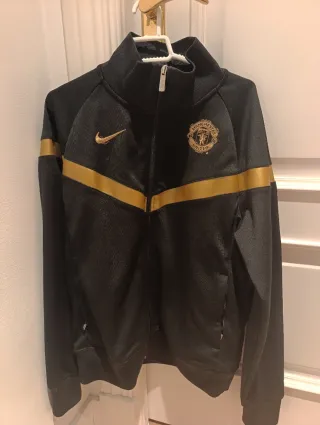 Sudadera deportiva del Manchester United 2009 con detalles dorados. - Diseño con cremallera completa. - Cuello alto. - Logo de Nike y escudo del club bordados.