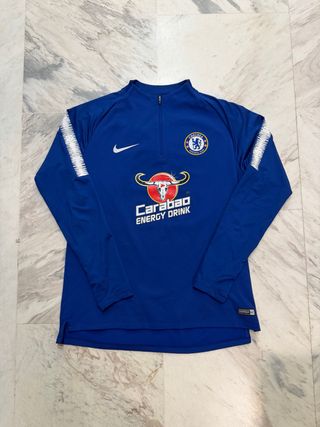 Sudadera del Chelsea Football Club de la temporada 2017/2018, con el patrocinio de Carabao Energy Drink. - Diseño deportivo con cuello alto y media cremallera. - Mangas largas con detalles blancos. - Escudo del club y logo de la marca en el pecho.