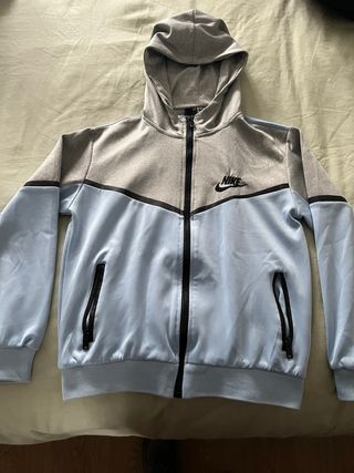 Sudadera Nike Tech de color gris con cremallera completa. - Diseño moderno y cómodo. - Bolsillos laterales con cremallera. - Capucha ajustable.