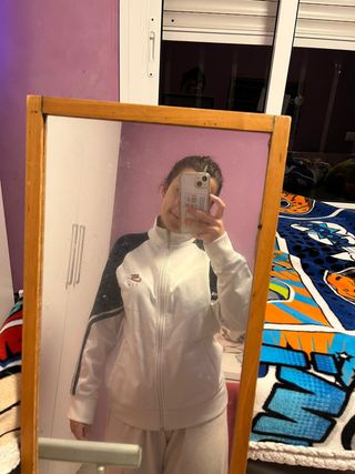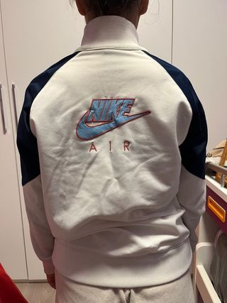 ⚠️ Nota importante: Etiqueta marca Talla L para niños, equivale a una S de adulto. Chaqueta deportiva Nike tipo track jacket en color blanco con franja horizontal y cremallera en contraste azul eléctrico. Diseño retro estilo Blokecore o Y2K con cuello alto y logo bordado en el pecho. Tejido cómodo y ligero, ideal para un look deportivo vintage.