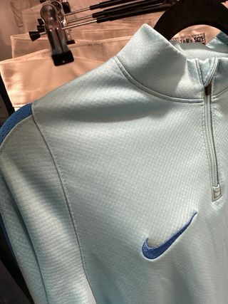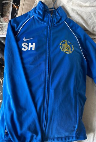 Sudadera deportiva azul de la marca Nike con iniciales. La talla marca la L, pero es un poco más ajustada. - Logo de St Albans City Youth Football Club bordado. - Iniciales SH en blanco. - Cierre de cremallera frontal.