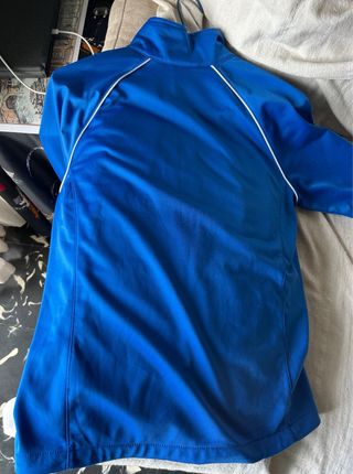 - Track Jacket estilo vintage de Nike. - Combina tonos azules con detalles en blanco. - Talla M - Cierre completo con cremallera. - Logo de Nike en el pecho. - Puños elásticos. - Bolsillos con cremallera.