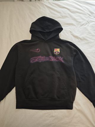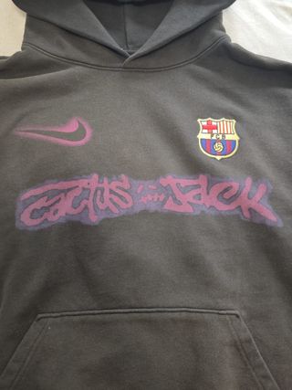 Sudadera con capucha Nike de color negro y morado, colaboración con el FC Barcelona y Cactus Jack. Es original y tengo el recibo - Diseño exclusivo de la colaboración entre Nike, FC Barcelona y Cactus Jack. - Logo del FC Barcelona y diseño tipo spray de Cactus Jack. - Talla (Especificar talla)