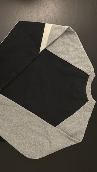 Sudadera de cuello redondo con un diseño moderno y bloques de color. - Diseño de tres colores: gris, blanco y negro. - Cuello redondo. - Etiqueta de la marca visible.