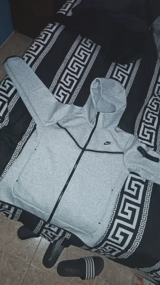 Conjunto deportivo Nike Tech Fleece en color gris, talla M. - Sudadera con capucha y cremallera completa. - Pantalón con bolsillos con cremallera. - Diseño moderno y cómodo.