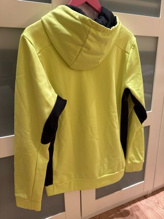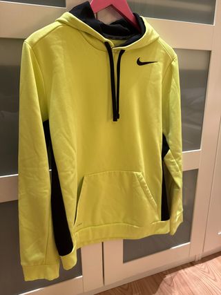 Sudadera con capucha de la marca Nike. - Diseño en color amarillo brillante con detalles en negro. - Logo de Nike en el pecho. - Bolsillo tipo canguro. - Cordones ajustables en la capucha. - Tecnología Dri-FIT para mayor transpirabilidad.