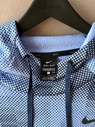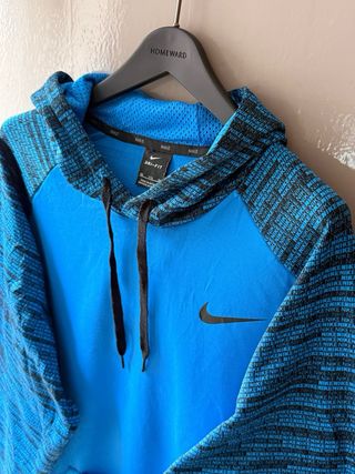 Sudadera con capucha Nike Therma-FIT (tecnología Dri-FIT) en color azul vibrante. Mangas raglán con estampado geométrico en tonos azul y negro que le da un toque moderno y diferente. Logo Swoosh bordado en el pecho, bolsillo canguro grande, cordones negros y capucha con interior de malla transpirable. Tejido técnico suave, elástico y que evacua el sudor – ideal para gym, running, pádel o simplemente para el día a día con comodidad máxima. Estado: Muy buen estado, casi como nueva. Usada pocas veces, sin bolitas, sin manchas, sin agujeros ni desperfectos. Colores intensos y logos perfectos. Lavada y lista para enviar. Talla: XXL
