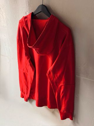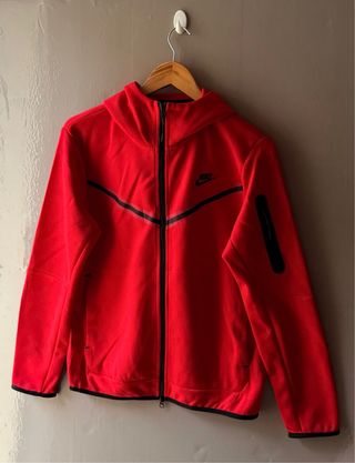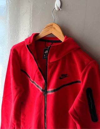 • Modelo: Nike Sportswear Tech Fleece Windrunner • Color: Rojo brillante / University Red con detalles en negro • Talla: M • Estado: 9.8/10 – Usada muy pocas veces, sin manchas, bolas, ni desgaste visible. Los puños y el bajo están perfectos, cremallera funciona a la perfección. • Material: El icónico Tech Fleece de Nike: calentito, ligero y con ese tacto premium tan característico. • Detalles: Bolsillos laterales con cremallera, bolsillo en la manga izquierda, capucha con cordones negros y el logo Nike bordado en el pecho. Es ese rojo vivo que queda brutal con cualquier outfit, tanto para looks sporty como para ir cómodo per