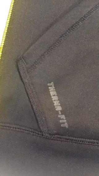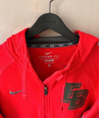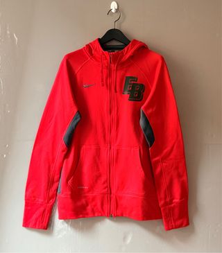 Preciosa sudadera Nike en color rojo vibrante, modelo Therma-FIT con tecnología que retiene el calor y gestiona la humedad, ideal para entrenamientos o uso diario en días fríos. Con capucha ajustable, bolsillos delanteros tipo canguro, cremallera completa y detalles en gris oscuro en codos y hombros para mayor durabilidad. Logo Swoosh pequeño en el pecho izquierdo (gris) y gran logo “FB” en negro en el lado derecho (posiblemente de equipo o edición especial, podría referirse a fútbol o un equipo escolar/universitario). Estado: En muy buen estado, usada con cuidado. Sin agujeros, manchas ni desperfectos visibles. Suave y cómoda por d