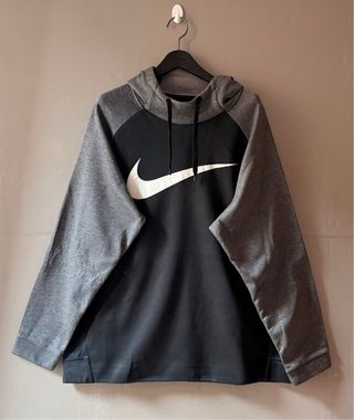 Perfecta para entrenamiento o uso diario: combinación de panel frontal negro liso con mangas y capucha en gris jaspeado. Tecnología Dri-FIT que evacua el sudor para mantenerte seco y cómodo. Diseño moderno y deportivo con cordones en la capucha y bolsillo tipo canguro. Estado: Muy buen estado, limpia y sin daños Talla: XL Ideal para gym, running o looks casual. ¡No te la pierdas! #Nike #SudaderaNike #DriFit #HoodieNike #SudaderaHombre #RopaDeportiva #GymWear #Streetwear #NikeSwoosh #TallaM