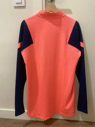 Sudadera de entrenamiento del Atlético de Madrid en color naranja. Presenta un diseño moderno con detalles degradados en las mangas. - Media cremallera en el cuello. - Escudo del club y logo de la marca en el pecho. - Inscripción Plus500 en la parte frontal.