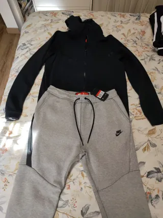 Conjunto de chándal Nike Tech Fleece. - Sudadera con capucha y cremallera completa. - Pantalones largos con diseño. - Combinación de colores negro y gris. -Nuevo pero no tiene etiqueta