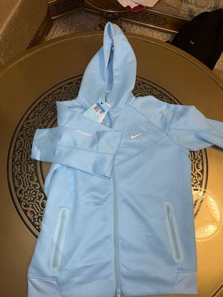 Sudadera deportiva de la marca Nike, con un diseño moderno y cómodo. - Color principal azul con detalles en negro. - Talla S. - Con etiquetas originales.