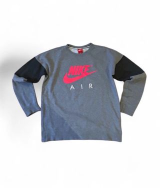 Sudadera gris con detalles en negro y logo Nike Air en rojo. - Mangas con paneles en contraste. - Cuello redondo. - Puños y bajo elásticos.