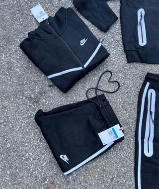 Conjunto deportivo Nike Tech de color negro con detalles reflectantes. - Cremallera completa en la sudadera. - Bolsillos con cremallera en la sudadera y pantalones. - Cintura elástica con cordón en los pantalones.