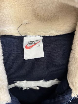 Chaqueta vintage Nike de tejido fleece, ideal para un estilo casual. - Cierre completo con cremallera. - Cuello alto con forro de borreguito. - Bolsillos frontales. - Logo de Nike bordado en el pecho.