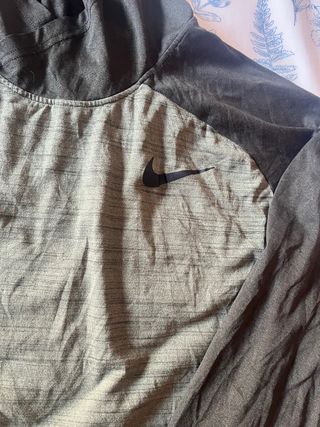 Sudadera Nike de color beige y blanco, con detalles en negro. Es una prenda cómoda y de buen gusto. Tiene unas manchitas en la manga (ultima foto). - Talla: (M) talla justa. - Diseño moderno y deportivo. - Perfecta para el día a día.