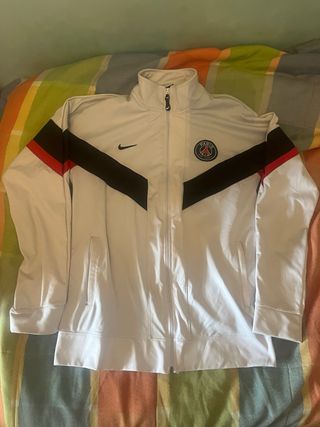 Sudadera con cremallera completa del Paris Saint-Germain (PSG) de Nike, en color blanco con detalles en negro. Muy cómoda, ligera y de buena calidad, ideal tanto para uso deportivo como para vestir. Talla L real (aunque en la etiqueta aparece XXL por un fallo de fábrica). En muy buen estado, sin rotos ni manchas. Bolsillos laterales con cremallera. Escudo PSG y logo Nike bordados. Cualquier duda o si quieres más fotos, escríbeme