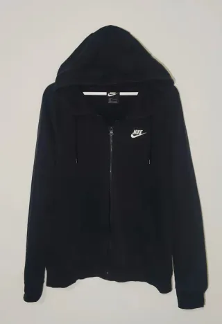 Chaquetilla de la marca Nike. Color negro. Muy buen estado. Sin grandes defectos. Un ligero desgaste en la tela en la zona de media de la cremallera. Capucha incorporada. Dos bolsillos laterales. Logo bordado en el pecho. 80% Algodón, 20% Poliéster. Talla L. Ancho de hombro 52 cm Ancho de axilas 61 cm Largo 66 cm