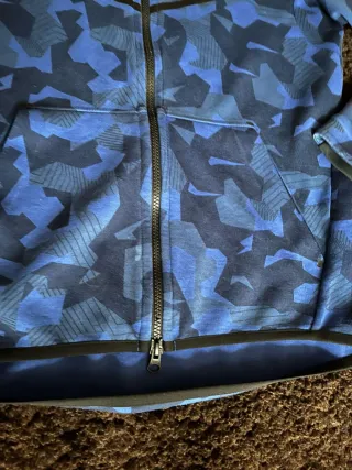 Sudadera Nike Sportswear original con cremallera completa y capucha, en estampado camuflaje azul/negro muy llamativo y diferente. ✨ Detalles: • Modelo: Nike Sportswear Club Fleece • Cremallera doble (se abre también desde abajo, muy cómoda) • Capucha ajustable con cordones • Bolsillos delanteros • Tejido suave y calentito, ideal para diario 📏 Medidas aproximadas: • Ancho: 53 cm • Largo: 62 cm ⚠️ Tiene una leve manchita que apenas se nota, se aprecia en una de las fotos. Estado general muy bueno. Cualquier duda o si quieres más fotos, escríbeme 😊