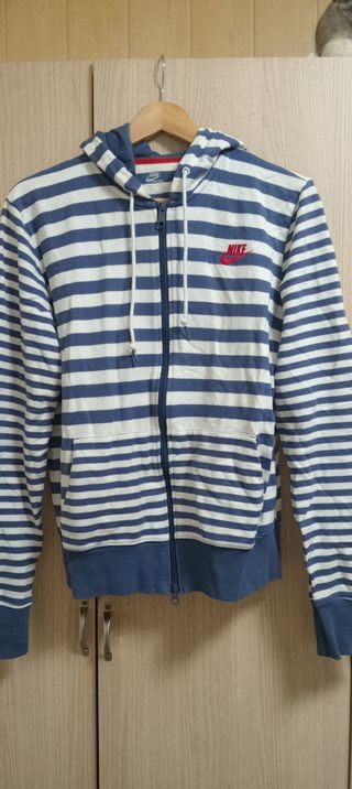 Chaqueta con capucha y cremallera completa, con un diseño de rayas horizontales. - Diseño de rayas azules y blancas. - Logo de Nike en color rojo.