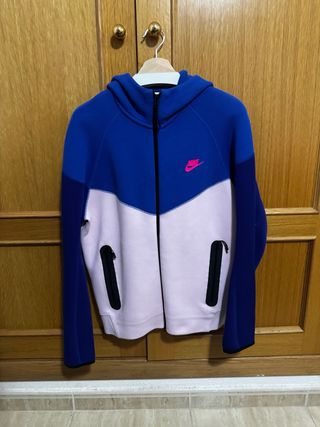Chaqueta deportiva Nike con un diseño vibrante y moderno talla xs a estrenar - Parte superior con estampado geométrico en tonos rosa y amarillo. - Mangas y parte inferior en color gris. - Capucha integrada. - Cierre de cremallera frontal.