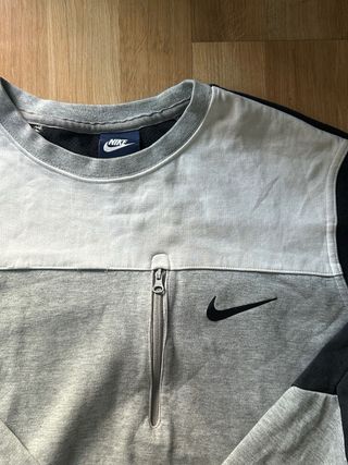 Sudadera vintage de Nike con un diseño moderno y cómodo. - Paneles de color gris claro y gris oscuro. - Mangas y detalles en color negro. - Cremallera parcial en la parte delantera. - Logo de Nike bordado.