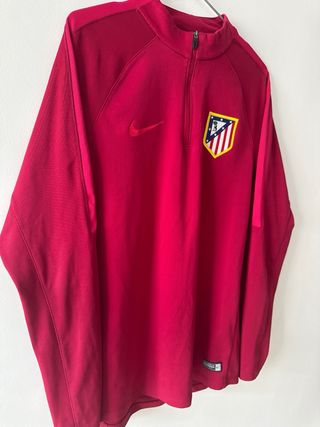 Sudadera deportiva del Atlético de Madrid de la temporada 2016/2017 - Diseño con cuello alto y media cremallera. - Escudo del club bordado en el pecho. - Logo de Nike en contraste.