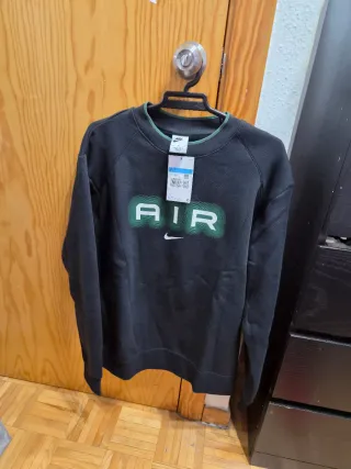 Sudadera deportiva con un diseño moderno y llamativo. - Combinación de colores negro y blanco. - Detalle del logo Nike Air en el pecho.