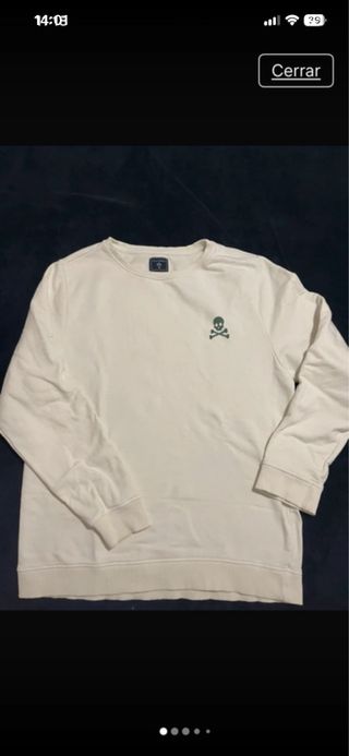 Sudadera de manga larga en color blanco con un discreto diseño. - Logo de calavera y tibias cruzadas en el pecho. - Cuello redondo. -lleva un pequeno cosido detras de la manga (Ver Foto) apenas se nota. -Por eso esta a este precio.